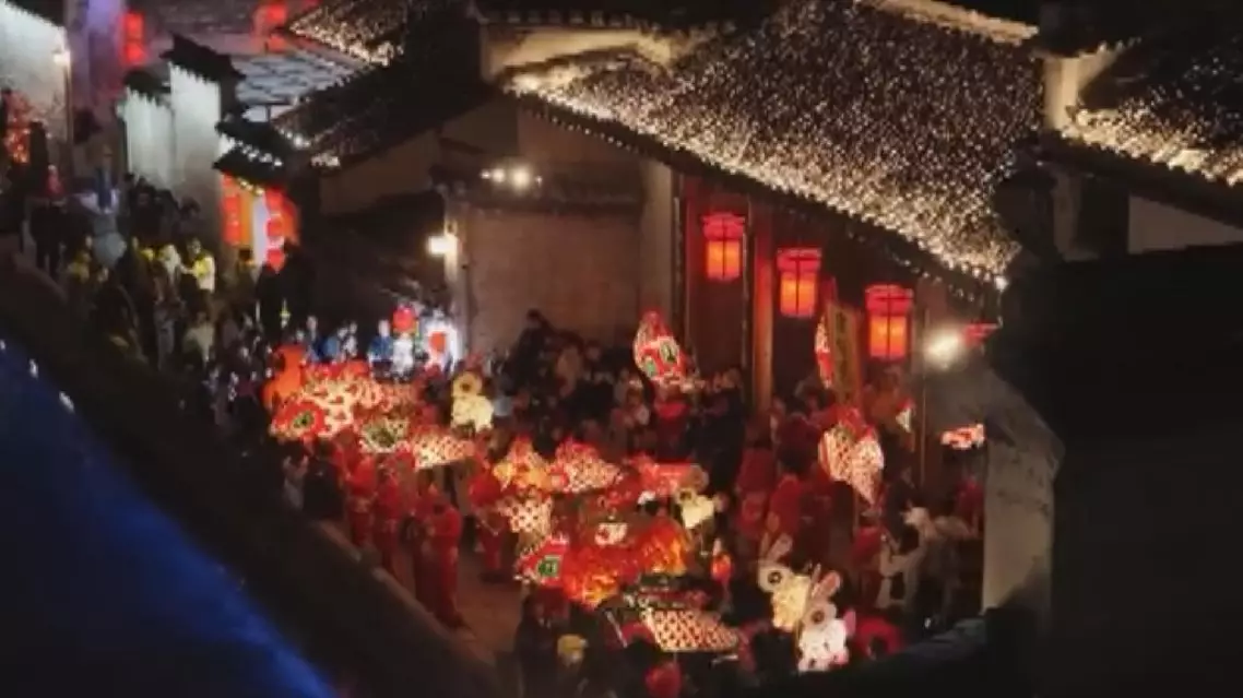 Fish lantern dance performances drew many tourists on Monday night to the rich festive atmosphere of an ancient village of Yixian County in east China's Anhui Province.