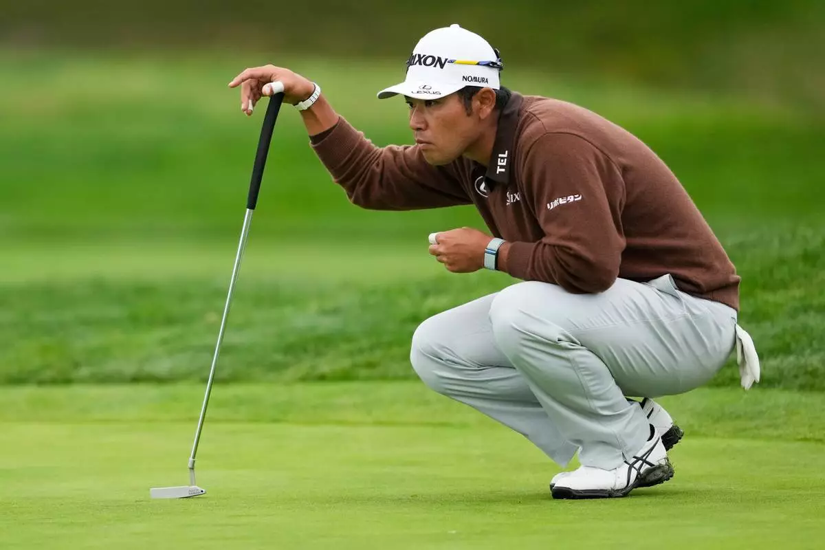 Hideki Matsuyama, of Japan, measures his putt on the second green at Pebble Beach Golf Links during the third round of the AT&T Pebble Beach Pro-Am golf tournament in Pebble Beach, Calif., Saturday, Feb. 14, 2026, in Pebble Beach, Calif. (AP Photo/Godofredo A. Vásquez)