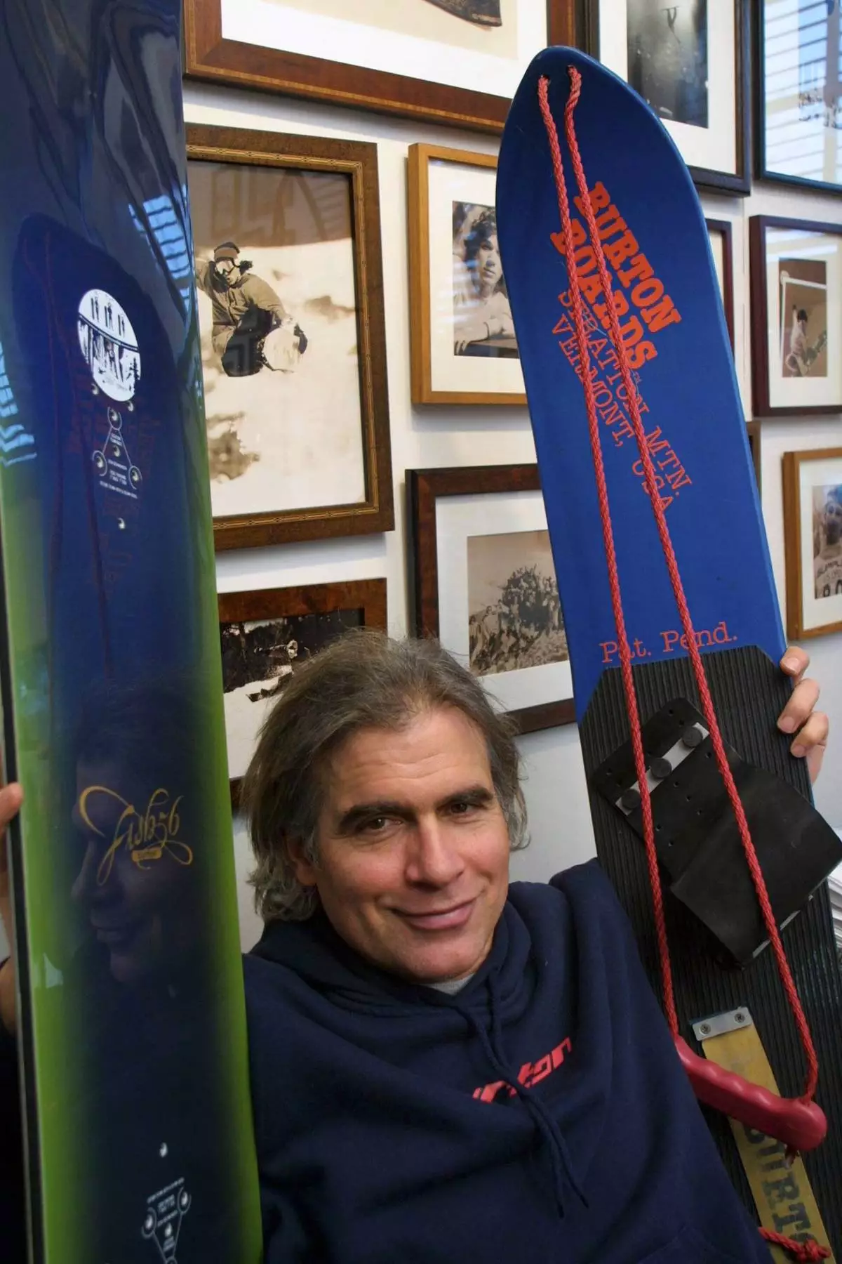 FILE - Jake Burton Carpenter, owner of Burton Snowboards, shows an early model, right, and one of the newer snowboards, left, in his office in Burlington, Vt., March 8, 2002. (AP Photo/Alden Pellett, File)
