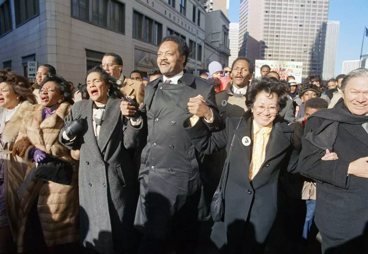 FILE - Coretta Scott King holds hands while singing with the Rev. Jesse Jackson and Christine Farris, the sister of Dr. Martin Luther King, Jr., as they parade on Peachtree Street in Atlanta on Monday, Jan. 19, 1987 to honor King's birthday. At left in Mrs. Alveda king Beall and at right is Lupita Aquino Kashiwahara. (AP Photo/Charles Kelly, File)