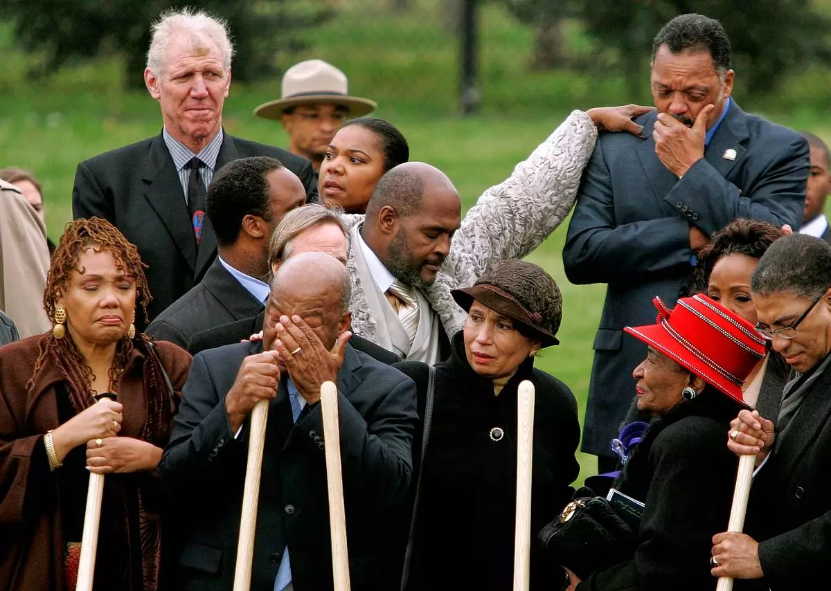 FILE - The Rev. Jesse Jackson, top right, is consoled by Rev. Marvin Winans, as Martin Luther King Jr.'s daughter Yolanda King, front from left, civil rights leader Rep. John Lewis, D-Ga., wiping his tears, former Labor Secretary Alexis Herman, Martin Luther King Jr.'s sister Christine King Farris and Darryl R. Matthews, President of the Alpha Phi Alpha Fraternity and Bill Walton, top left, take part in the ground breaking ceremony for the Martin Luther King Jr. Memorial on the National Mall, Nov. 13, 2006 in Washington. (AP Photo/Evan Vucci, File)