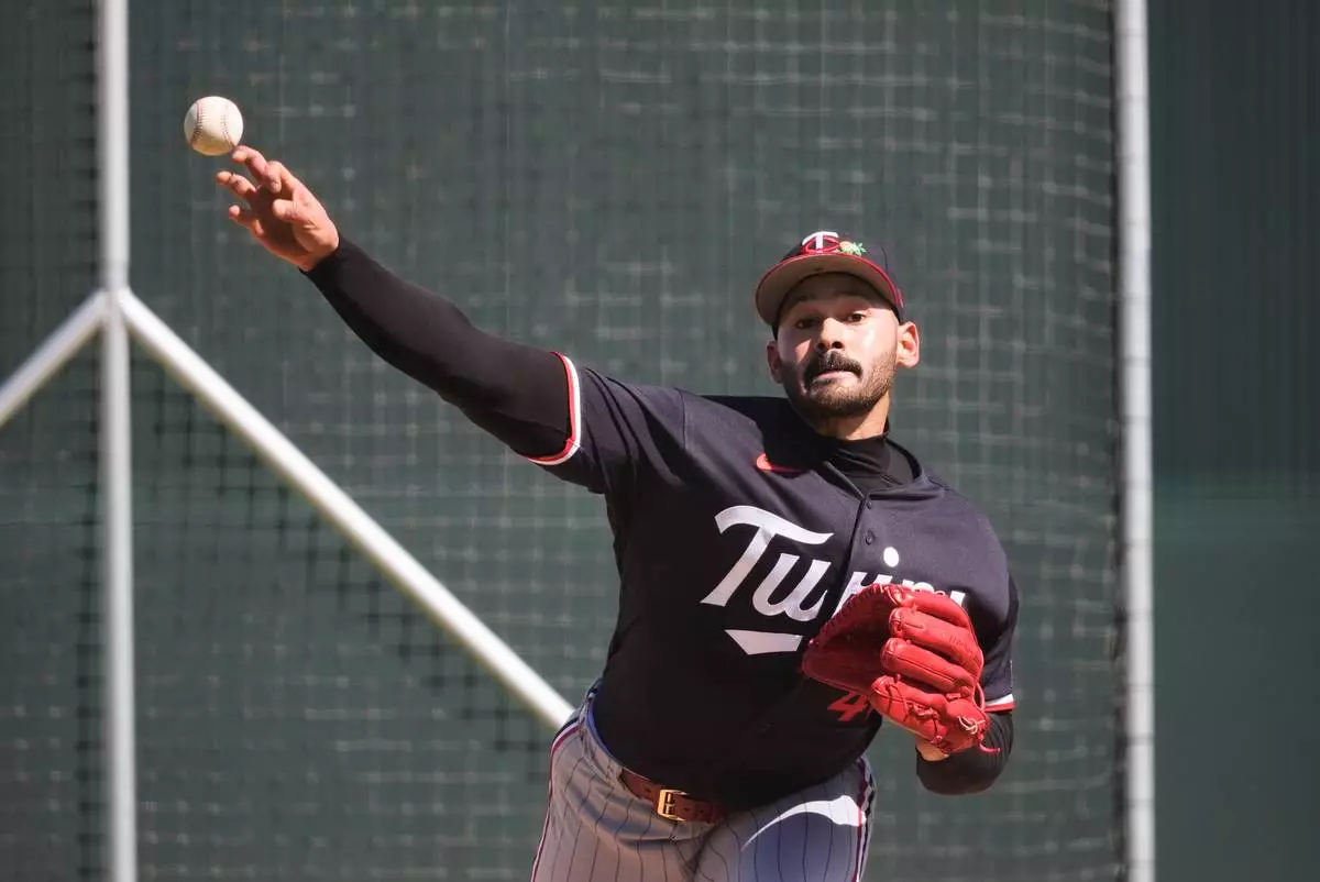 Minnesota Twins pitcher Pablo Lopez warms up during a spring training baseball workout in Fort Myers, Fla., Monday, Feb. 16, 2026. (AP Photo/Gerald Herbert)