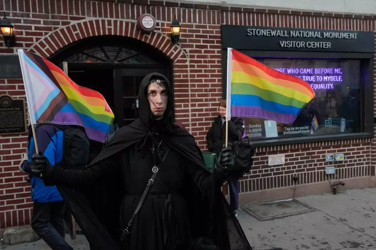 A protestor stands outside the Stonewall Inn National Monument Visitor Center after New York politicians and activists raised a rainbow flag on a pole in Christopher Park across the street, Thursday, Feb. 12, 2026, in New York, a few days after it was removed by the National Park Service to comply with guidance from the Trump administration. (AP Photo/Yuki Iwamura)