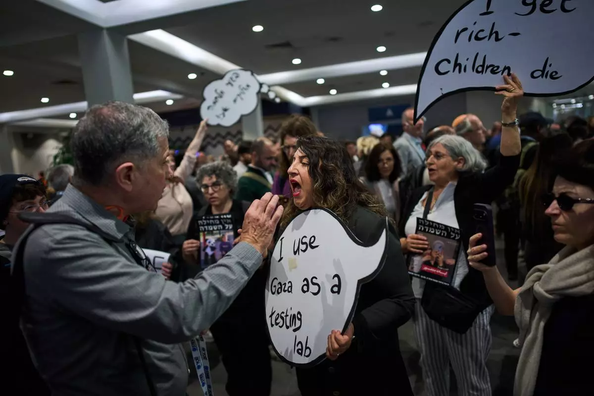Activists protest against a defense industry exhibition in Tel Aviv, Israel, Tuesday, Feb. 17, 2026. (AP Photo/Oded Balilty)