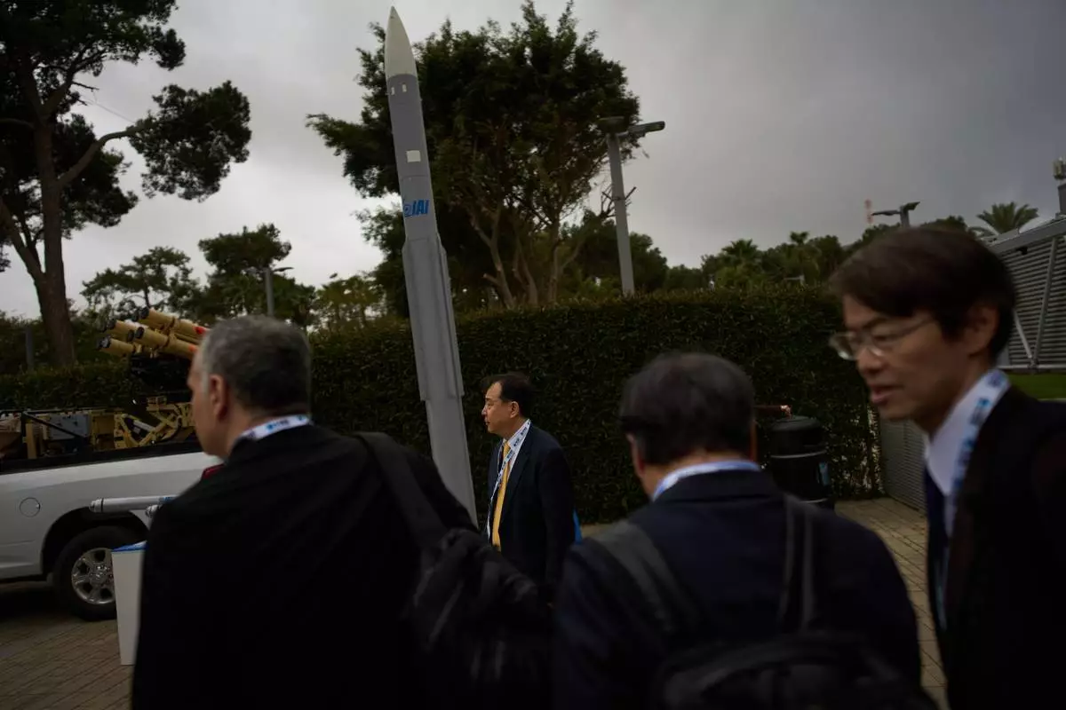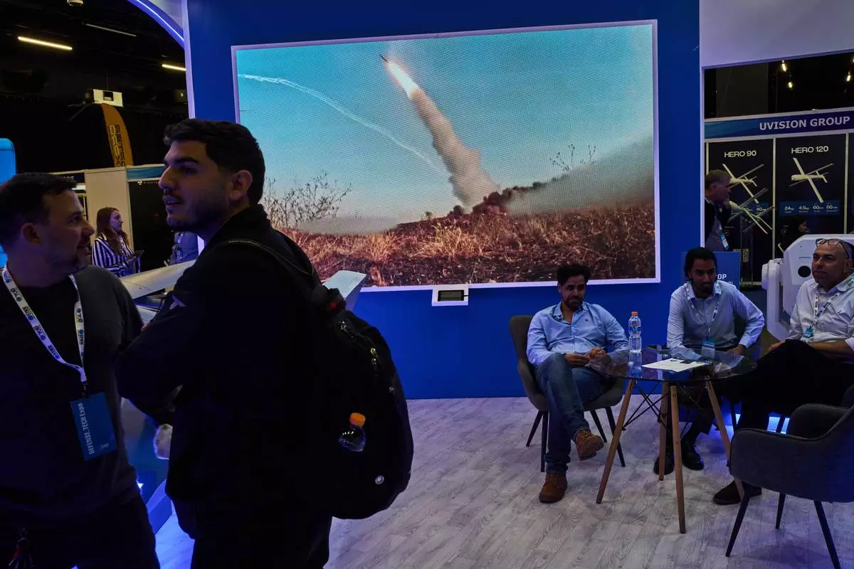 TEL AVIV, Israel (AP) — Rifles are lifted from display racks, drones hover above exhibition stands and large screens loop footage of missile launches inside the halls of Expo Tel Aviv convention center as it hosts the Defense Tech Expo Israel 2026.