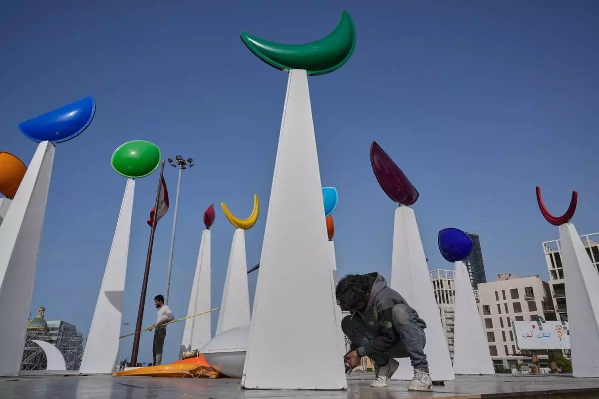 A worker sets decorations in preparation for the upcoming Muslim holy month of Ramadan, in downtown Beirut, Lebanon, Tuesday, Feb. 17, 2026. (AP Photo/Hussein Malla)