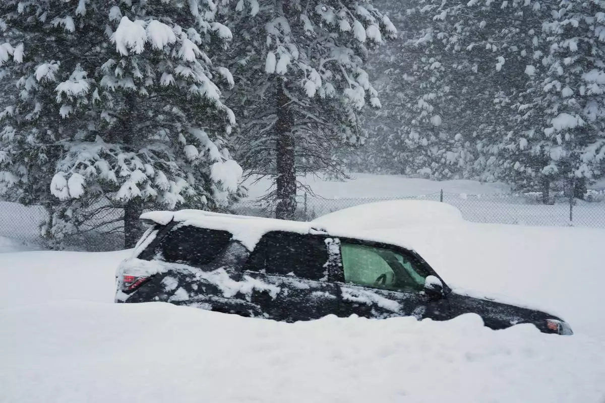 A vehicle is buried in snow during a storm on Tuesday, Feb. 17, 2026 in Truckee Calif. (AP Photos/Brooke Hess-Homeier)