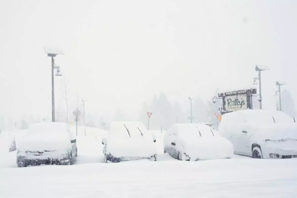Cars are covered in snow during a snow storm on Tuesday, Feb. 17, 2026 in Truckee Calif. (AP Photos/Brooke Hess-Homeier)
