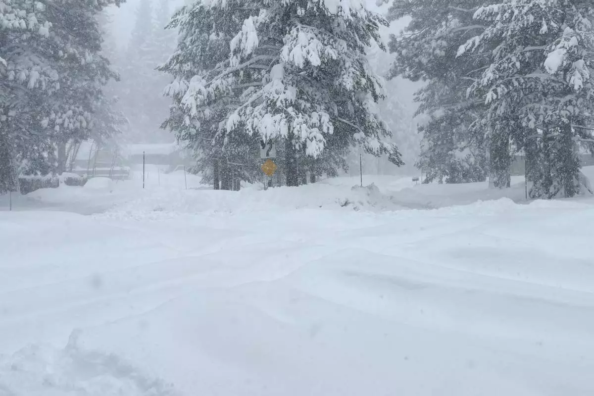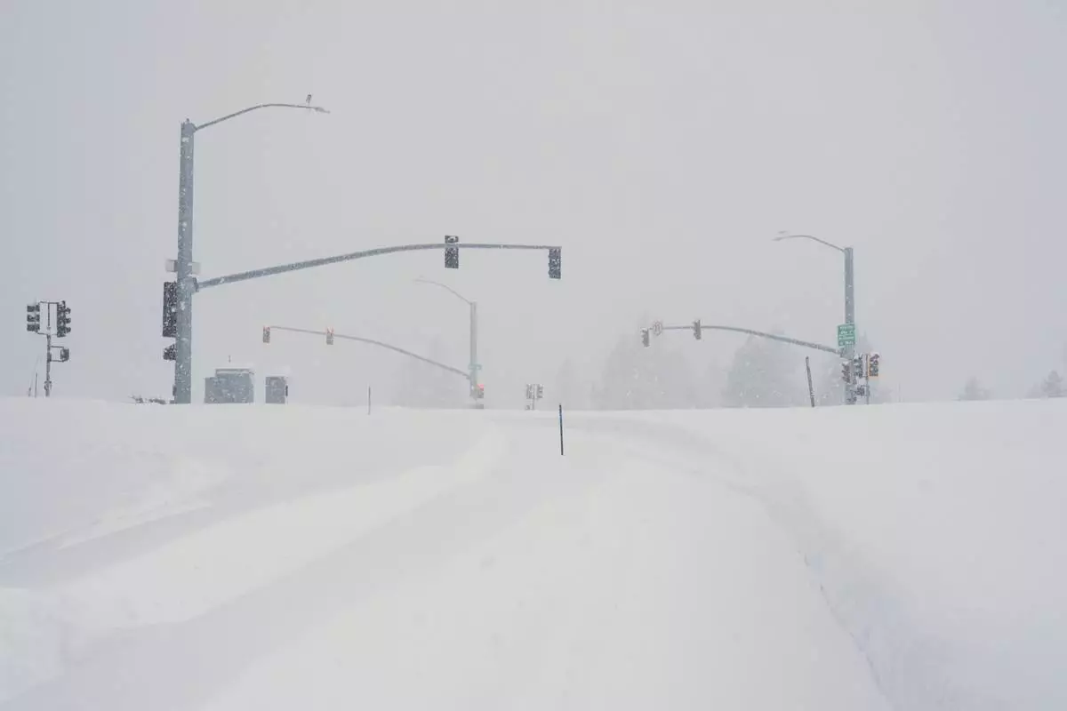 A road is covered in snow during a storm on Tuesday, Feb. 17, 2026 in Truckee Calif. (AP Photos/Brooke Hess-Homeier)