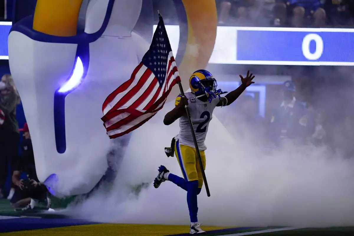 FILE - Los Angeles Rams wide receiver Robert Woods carries a flag as part of the league's Salute to Service before an NFL football game against the Tennessee Titans Nov. 7, 2021, in Inglewood, Calif. (AP Photo/Ashley Landis, File)