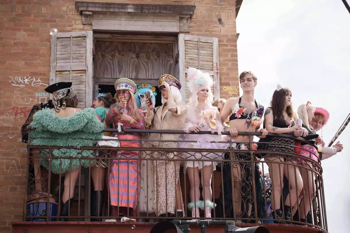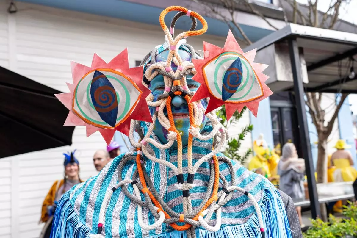 People participating in the Society of Saint Anne parade wander through the Bywater and Marigny neighborhoods on Mardi Gras Day, Tuesday, Feb. 17, 2026 in New Orleans. (AP Photo/Matthew Hinton)