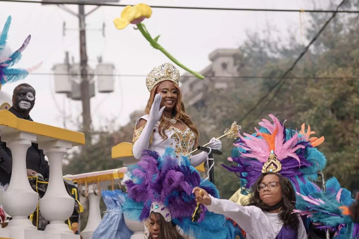 Zulu Queen Sharell Monique Chatman waves to the crowd on Mardi Gras Day, Tuesday, Feb. 17, 2026 in New Orleans. (AP Photo/Matthew Hinton)