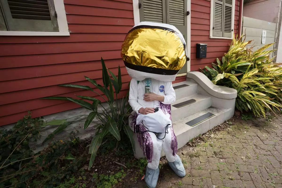 A person participating in the Society of Saint Anne parade sits on a front stoop of a buidling during Mardi Gras Day, Tuesday, Feb. 17, 2026 in New Orleans. (AP Photo/Matthew Hinton)