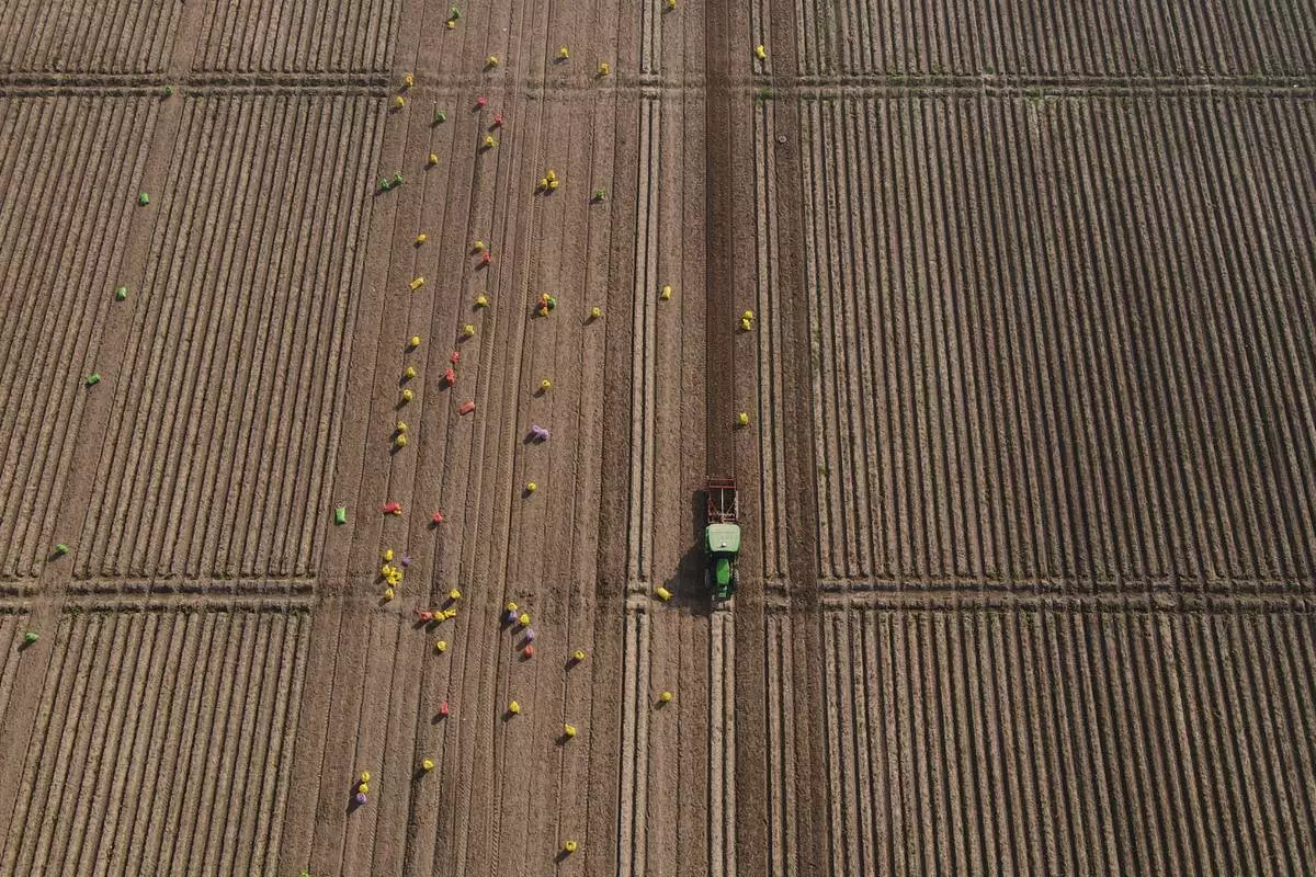 Workers follow an AI-operated driverless tractor harvesting potatoes at Bir Virk's farm near Karnal, India, on Feb. 10, 2026. (AP Photo/Piyush Nagpal)
