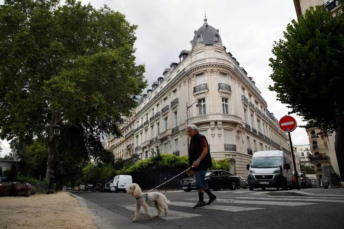FILE - In this Aug.13, 2019 file photo, a man walks his dog next to an apartment building owned by Jeffrey Epstein in Paris. (AP Photo/Francois Mori, File)