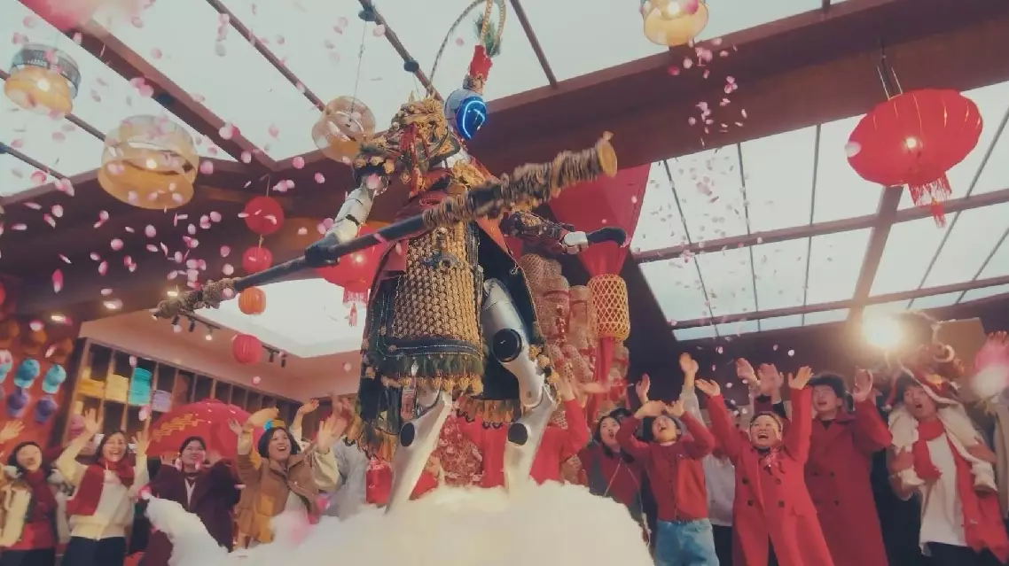 But the street's most surprising residents weren't human. In a stunning fusion of tradition and technology, Unitree Robotics' latest creations took the center stage. The company's full-size humanoid robot H2 appeared dressed as the legendary Monkey King, complete with a heavy armor and the mythical Golden Cudgel.
