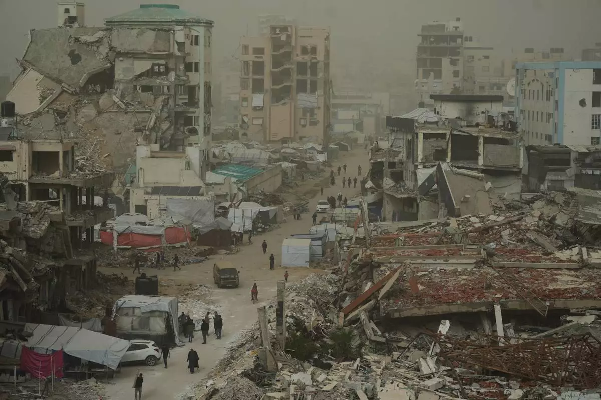 FILE - Palestinians walk along a street surrounded by buildings destroyed in Israeli air and ground operations during a dust storm in Gaza City, Saturday, Feb. 14, 2026. (AP Photo/Jehad Alshrafi)