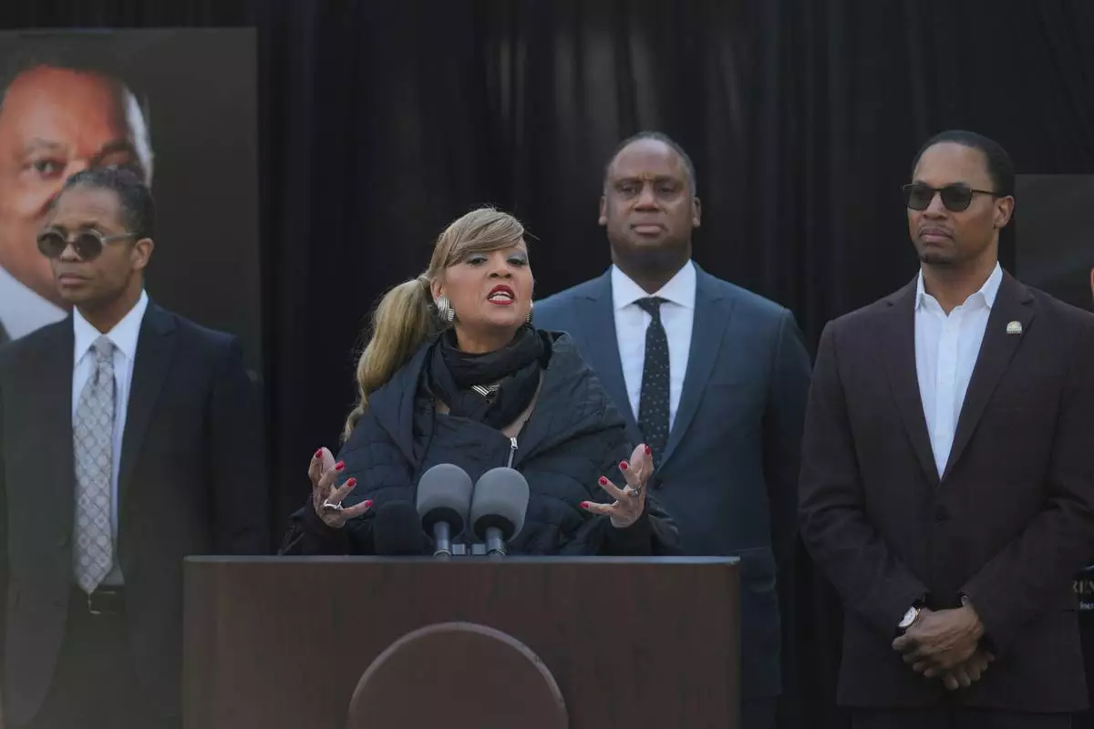 Santita Jackson speaks during a news conference regarding the death of her father, the Rev. Jesse Jackson, outside the family home Wednesday, Feb. 18, 2026, in Chicago. (AP Photo/Erin Hooley)