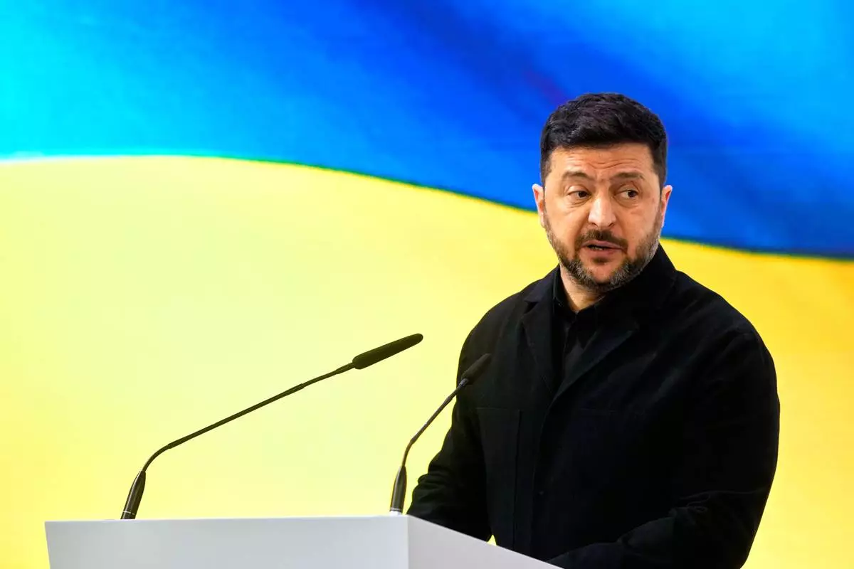 Ukraine's President Volodymyr Zelenskyy addresses the audience during a session at the Munich Security Conference in Munich, Germany, Saturday, Feb. 14, 2026. (AP Photo/Michael Probst)