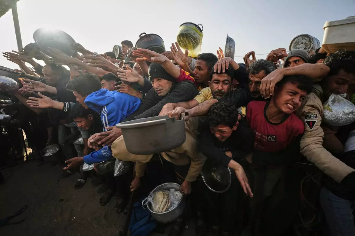 Displaced Palestinian struggle to receive donated food for iftar, the fast-breaking meal, on the first day of the Muslim holy month of Ramadan at a community kitchen in Khan Younis, Gaza Strip, Wednesday, Feb. 18, 2026. (AP Photo/Jehad Alshrafi)