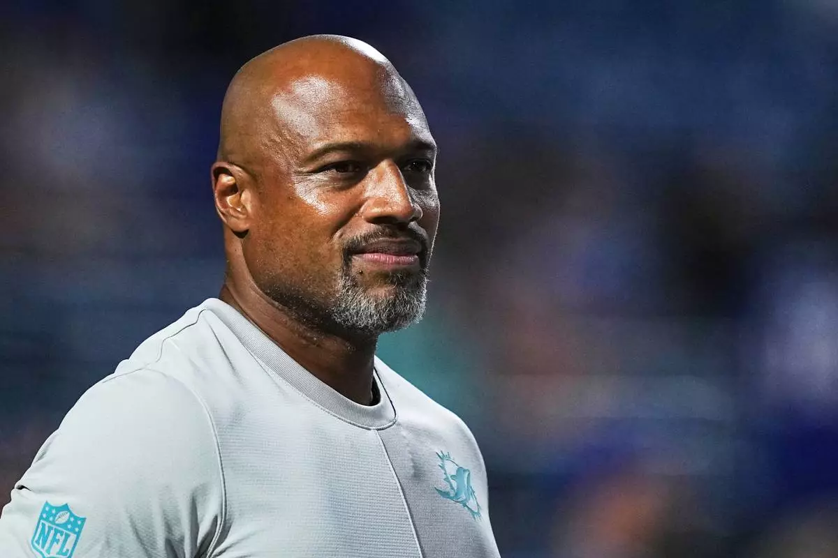 FILE Miami Dolphins defensive coordinator Anthony Weaver stands on the field before an NFL football game against the Buffalo Bills, Sept. 18, 2025, in Orchard Park, N.Y. (AP Photo/Matt Rourke, File)