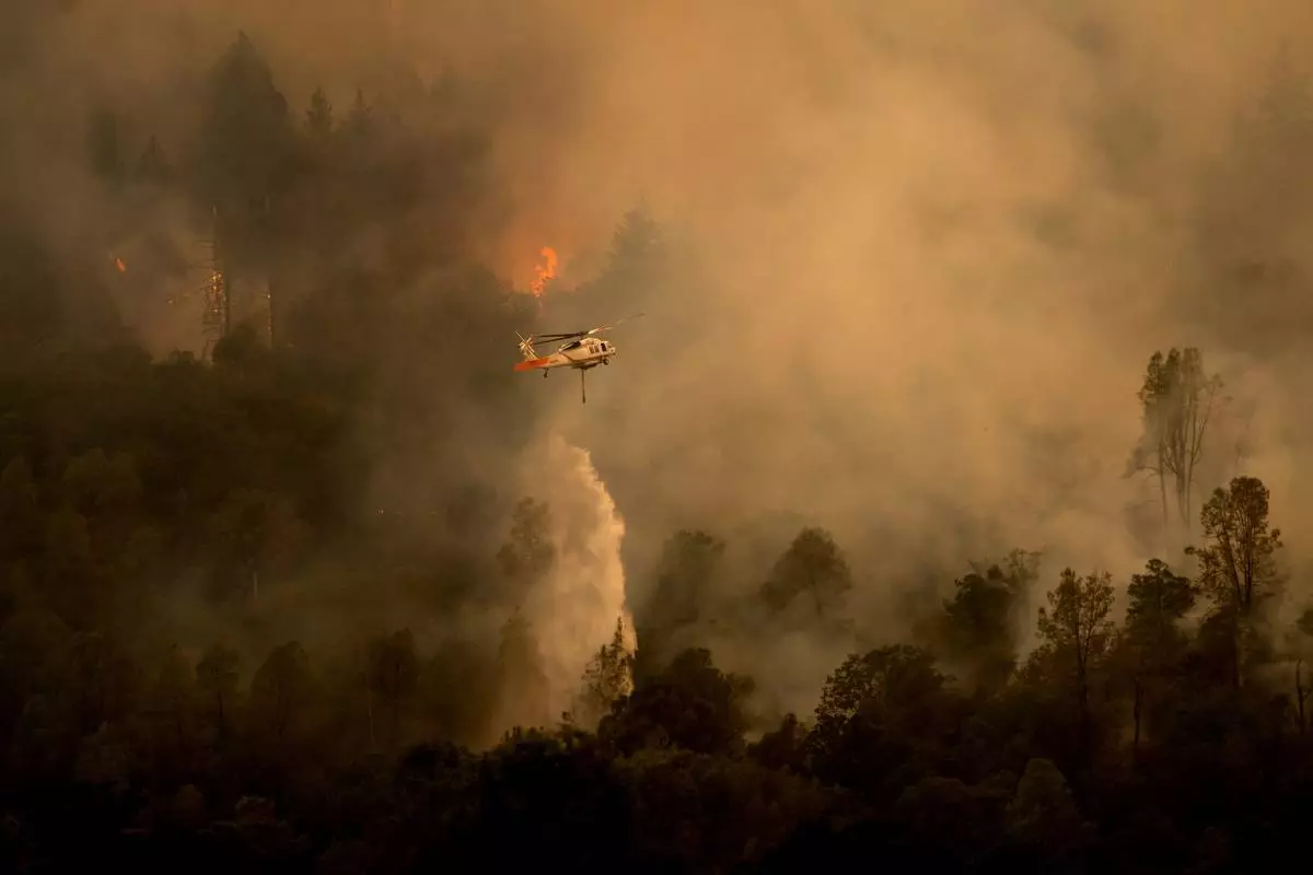 FILE - A helicopter drops water on the Pickett Fire as it burns into the Aetna Springs area of Napa County, Calif., Aug. 23, 2025. (AP Photo/Noah Berger, File)
