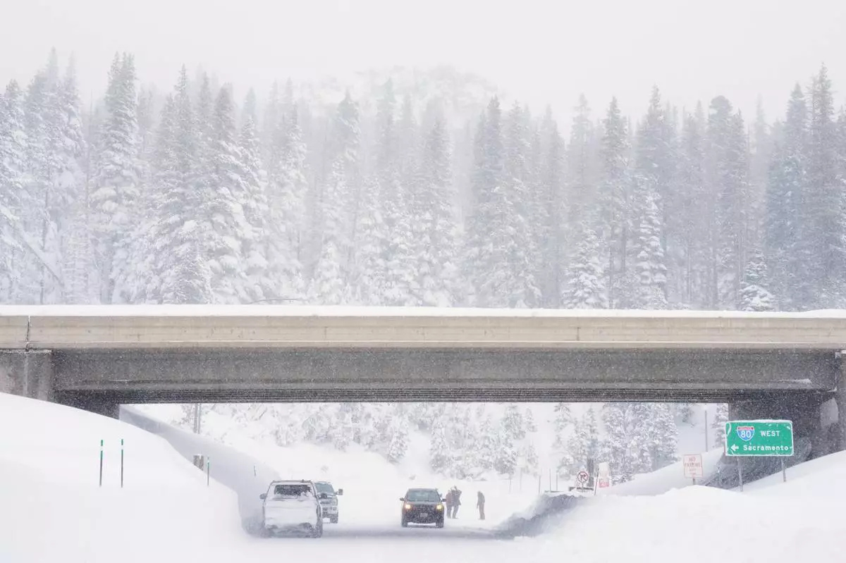 Trucks are lined up along Interstate 80 during a storm on Tuesday, Feb. 17, 2026 in Truckee Calif. (AP Photos/Brooke Hess-Homeier)