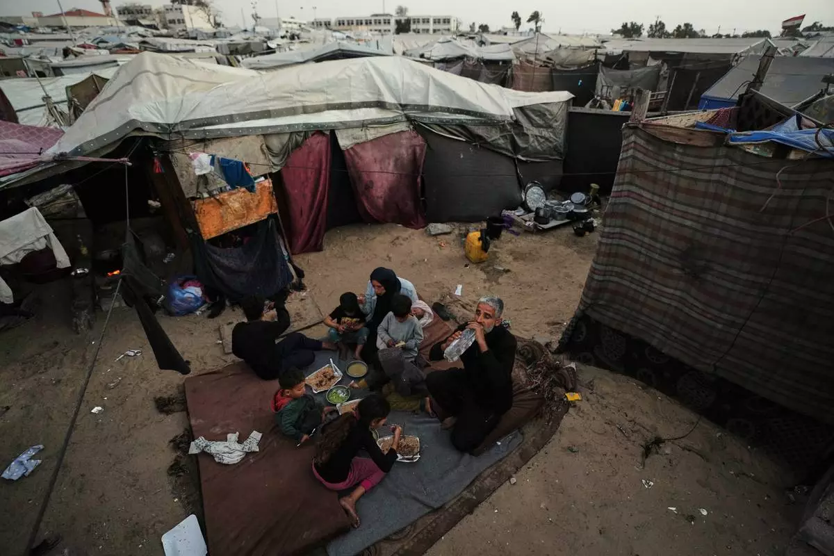 Displaced members of the Al-Zamli family break their fast on the first day of Ramadan inside their tent in Khan Younis, Gaza Strip, Wednesday, Feb. 18, 2026. (AP Photo/Jehad Alshrafi)