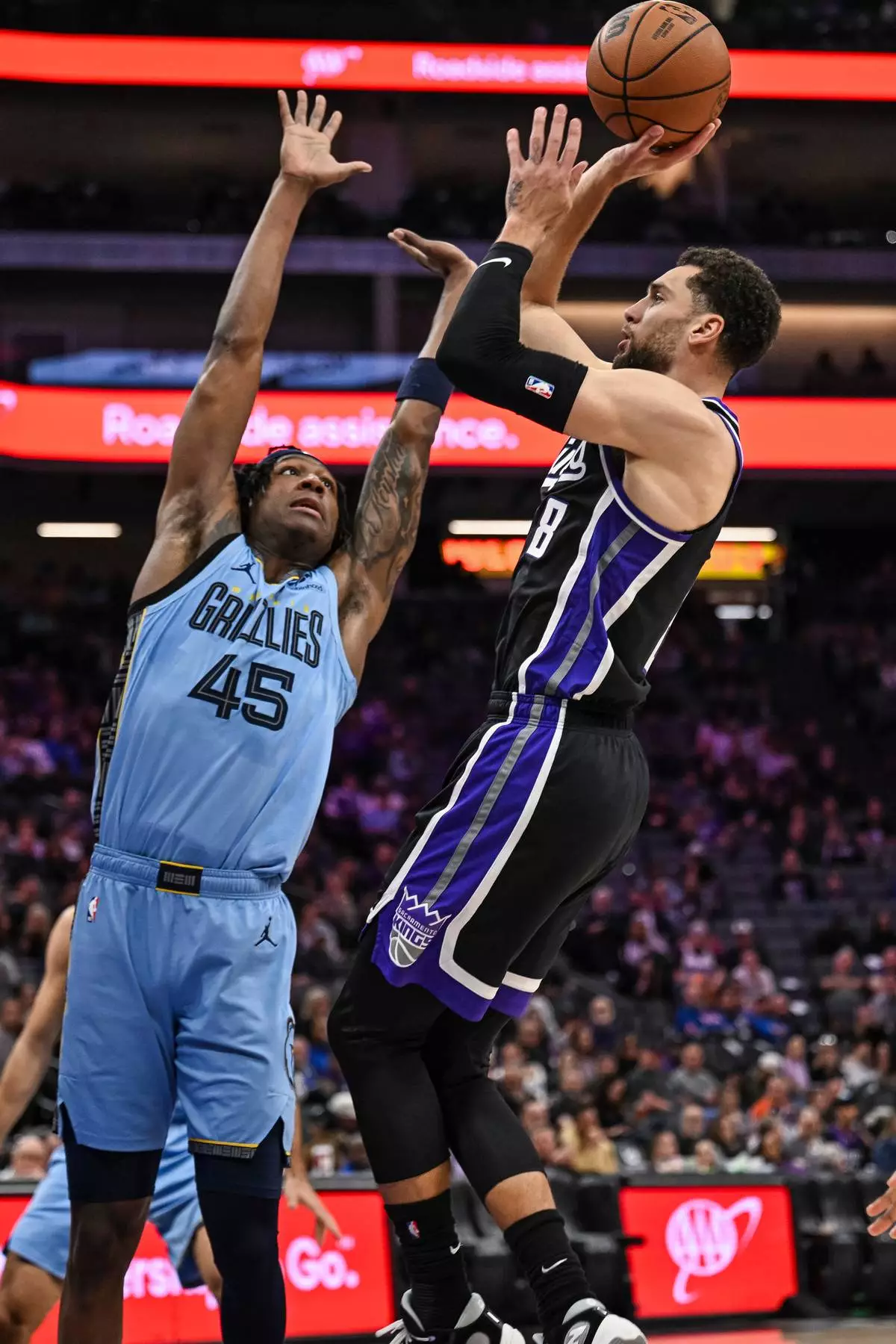 Sacramento Kings guard Zach LaVine (8) shoots over Memphis Grizzlies forward GG Jackson (45) during the second half of an NBA basketball game, Wednesday, Feb. 4, 2026, in Sacramento, Calif. (AP Photo/Justine Willard)