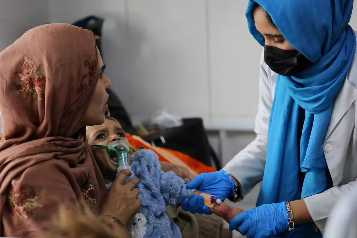 Latifa Bakkar attempts to give oxygen to her severely malnourished 2½-year-old son, Abu Bakar, as a nurse inserts an intravenous cannula into his arm at Indira Gandhi Children's Hospital in Kabul, Afghanistan, Sunday, Feb. 15, 2026. (AP Photo/Siddiqullah Alizai)