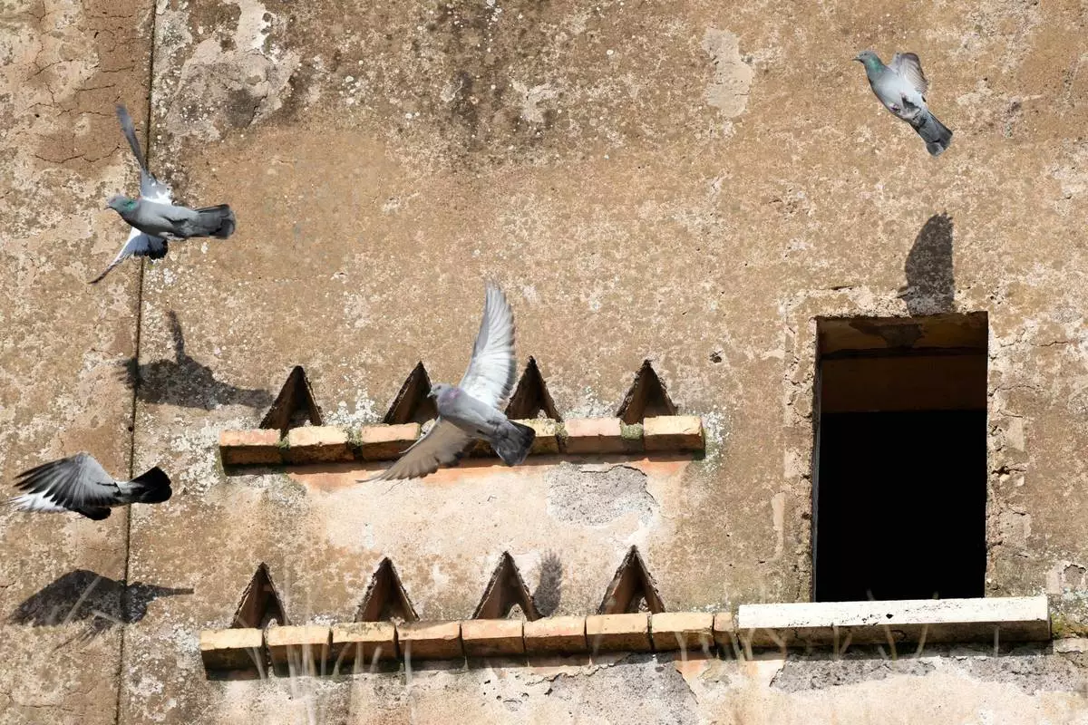 Pigeons fly away from the farmhouse at the Degemar Quarry near Tivoli, Italy, 35 kilometers east of Rome, on Friday, Feb. 13, 2026, where 17th-century Baroque architect Gian Lorenzo Bernini selected travertine for the colonnade of St. Peter's Square. (AP Photo/Gregorio Borgia)