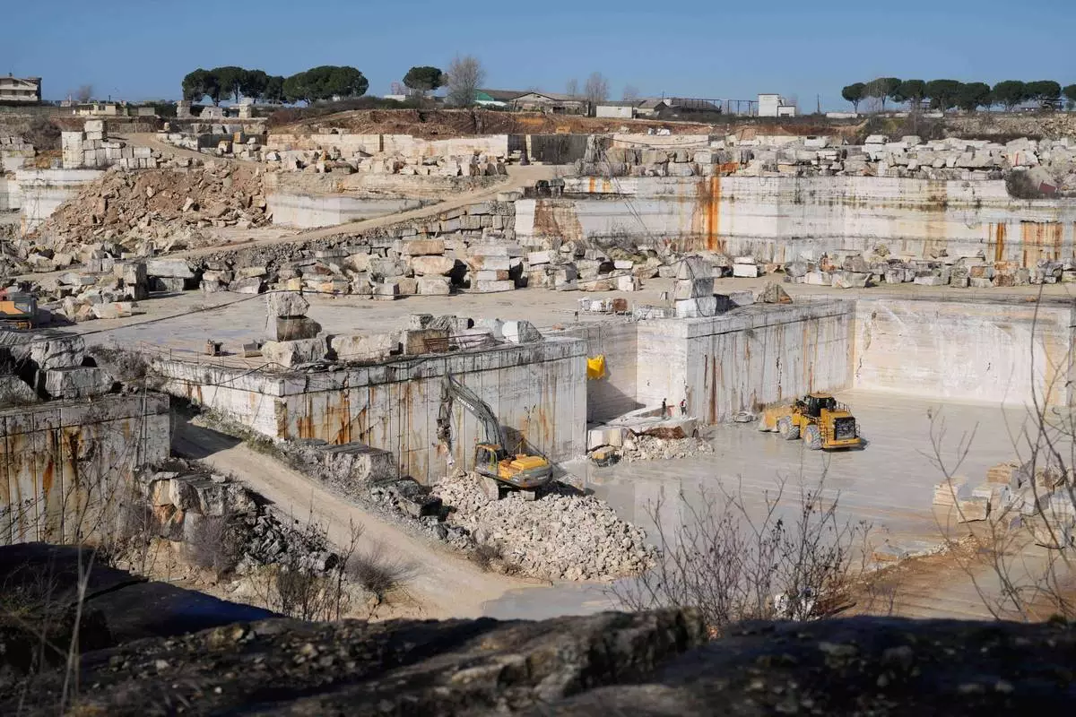 At the Degemar quarries, drilled down to 30 meters (yards) under sea level, bright blue ponds of sulfur springs pool the travertine residue as flat-bed trucks haul stone slabs weighing 33 tons up to street level.