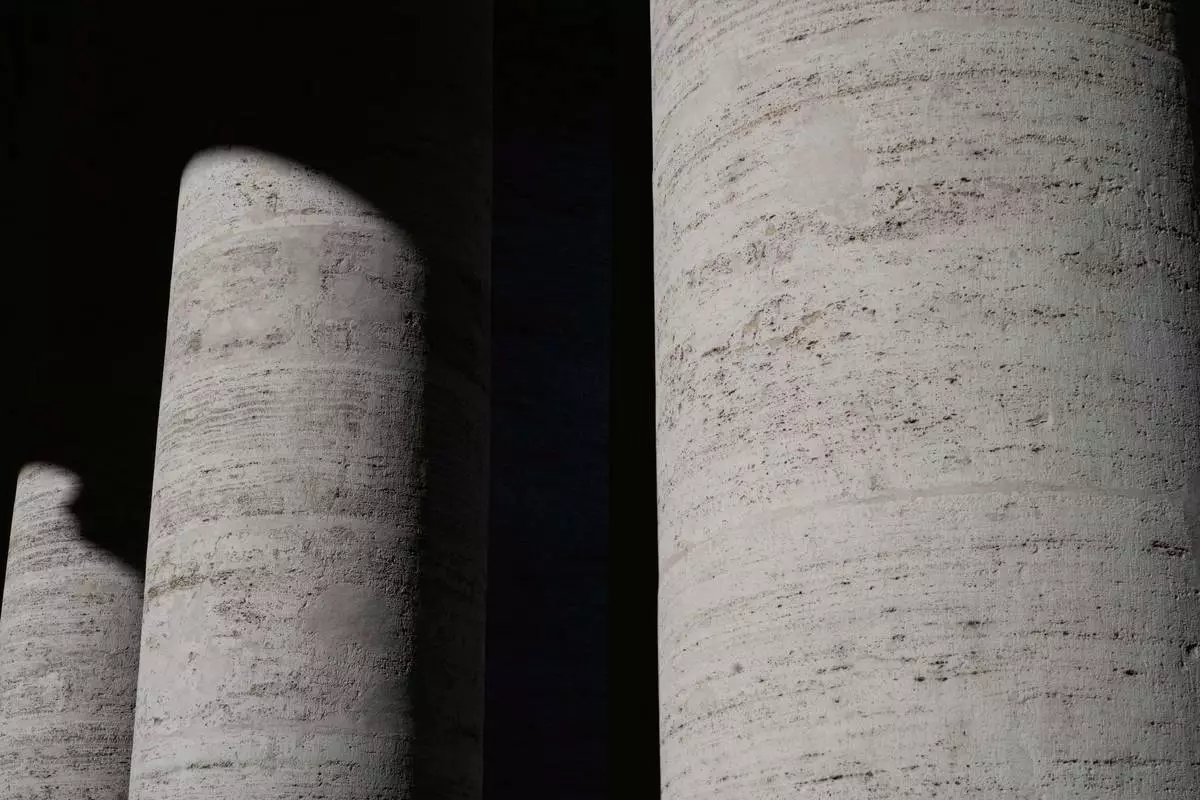 A view of Gian Lorenzo Bernini's 17th-century colonnade in St. Peter's Square in Vatican City, on Sunday, Feb. 15, 2026, which was built with travertine from Tivoli, Italy, 35 kilometers east of Rome. (AP Photo/Gregorio Borgia)