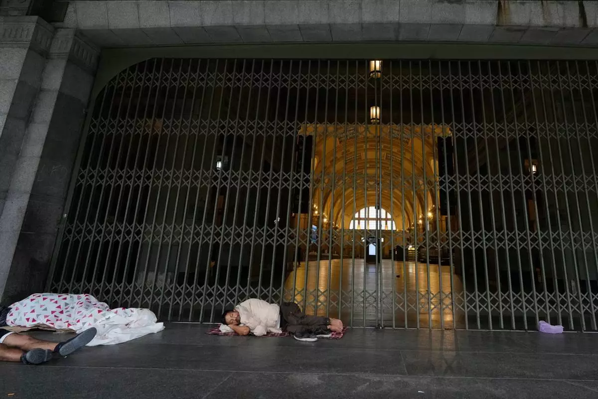 People sleep near the closed entrances of Constitucion railway station during a union strike against a proposed labor reform bill in Buenos Aires, Argentina, Thursday, Feb. 19, 2026. (AP Photo/Gustavo Garello)