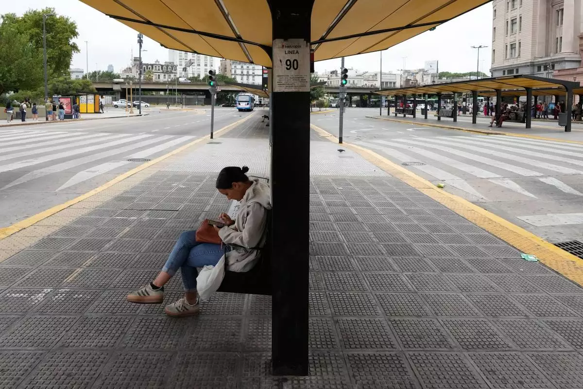 A woman sits at a bus stop during a union strike against a proposed labor reform bill in Buenos Aires, Argentina, Thursday, Feb. 19, 2026. (AP Photo/Gustavo Garello)