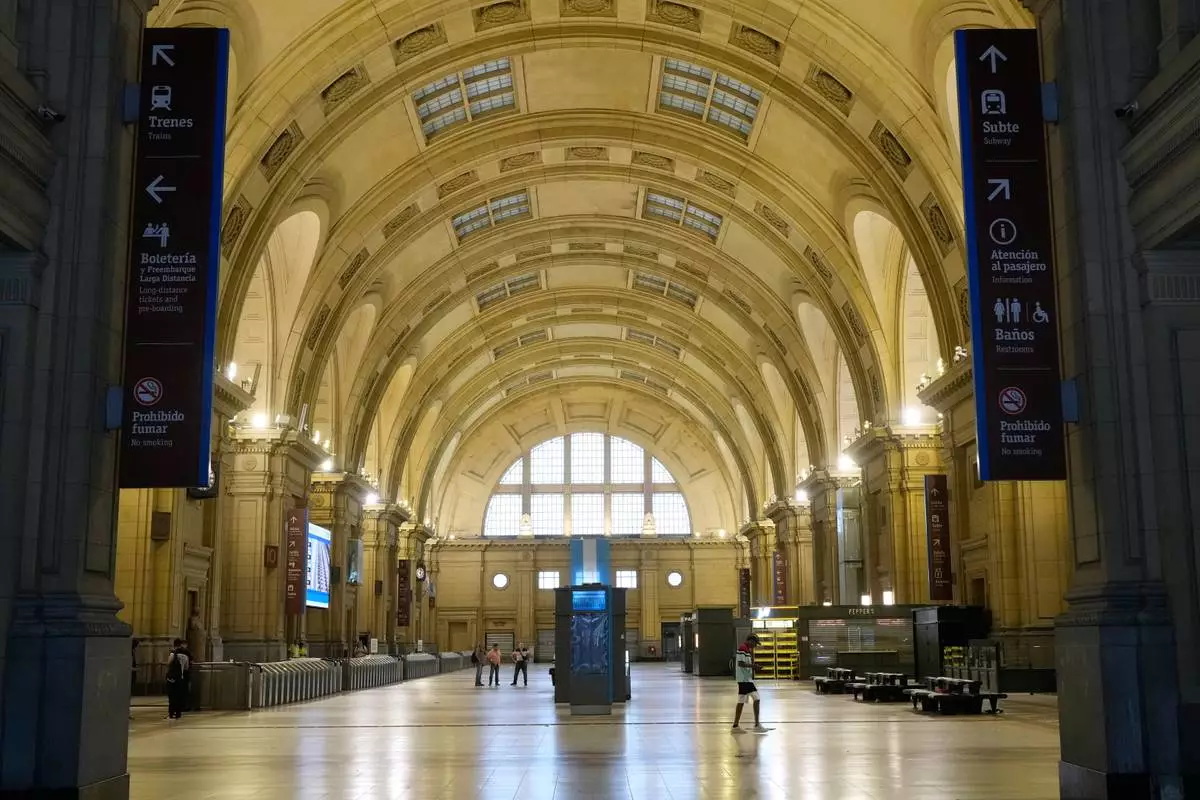People wait inside the Constitucion railway station that is empty due to a union strike against a proposed labor reform bill in Buenos Aires, Argentina, Thursday, Feb. 19, 2026. (AP Photo/Gustavo Garello)