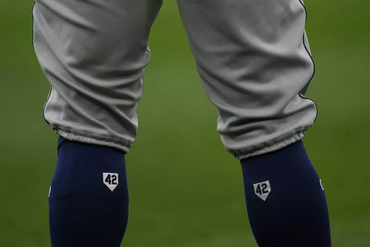 Tampa Bay Rays' Jonathan Aranda socks with number 42 for Jackie Robinson Day before a baseball game against the Chicago White Sox, Wednesday, April 15, 2026, in Chicago. (AP Photo/Erin Hooley)
