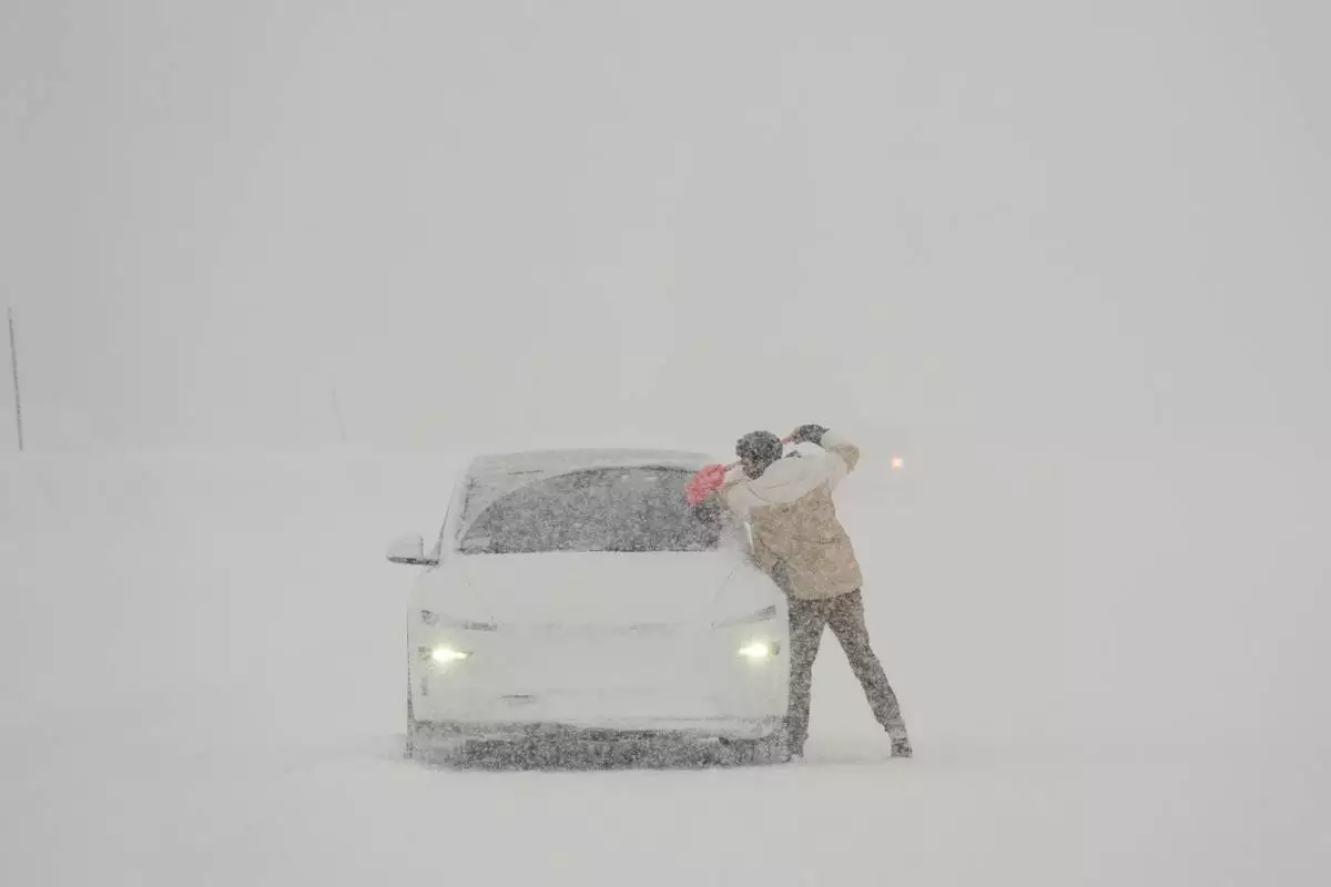 A motorist exits a vehicle during a snow storm Wednesday, Feb. 18, 2026, in Placer County, Calf. (AP Photo/Godofredo A. Vásquez)