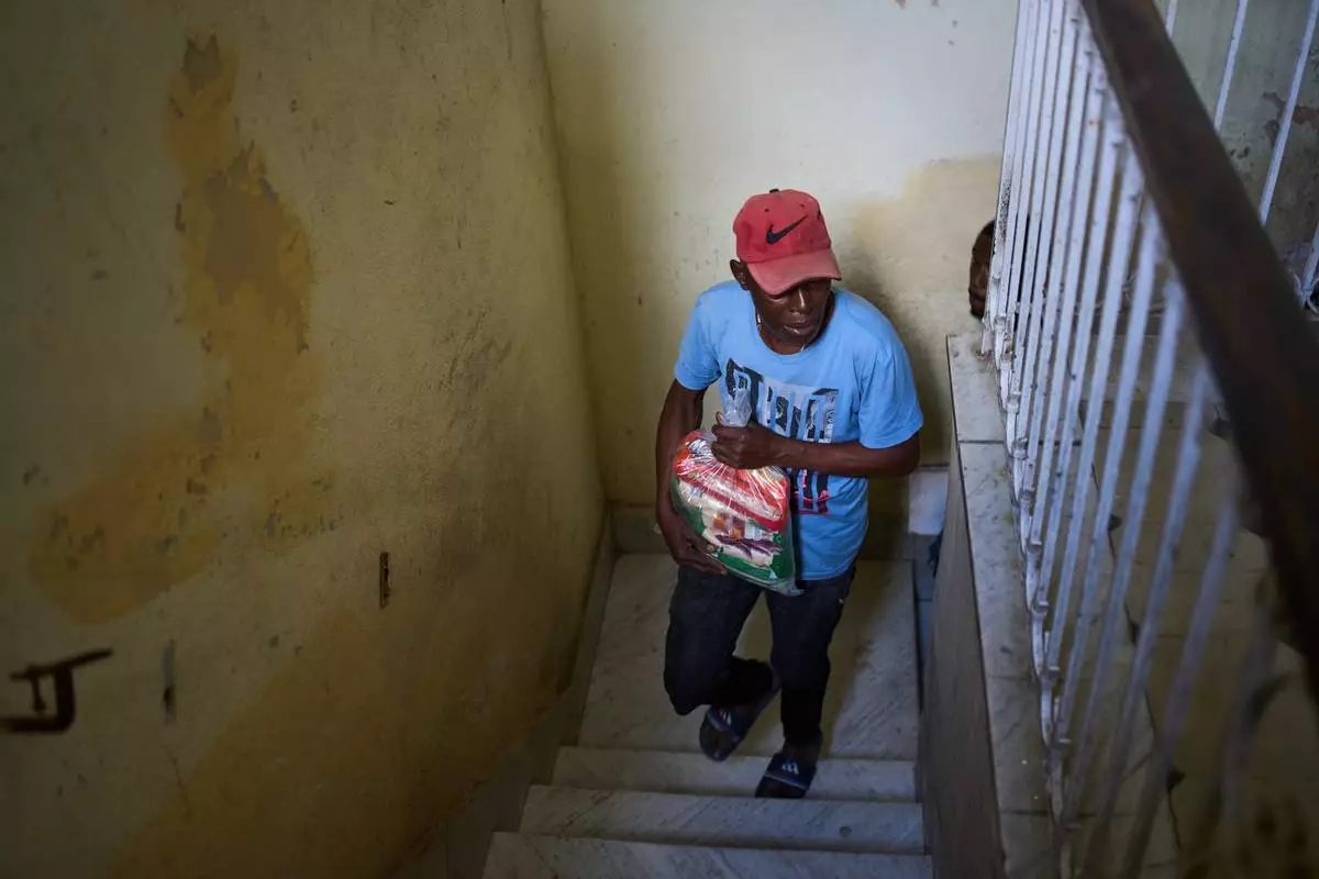 Guillermo Beltrán, a recipient of Mexican humanitarian assistance, carries a bag of donated items as he arrives at his home in Havana, Cuba, Thursday, Feb. 19, 2026. (AP Photo/Ramon Espinosa)