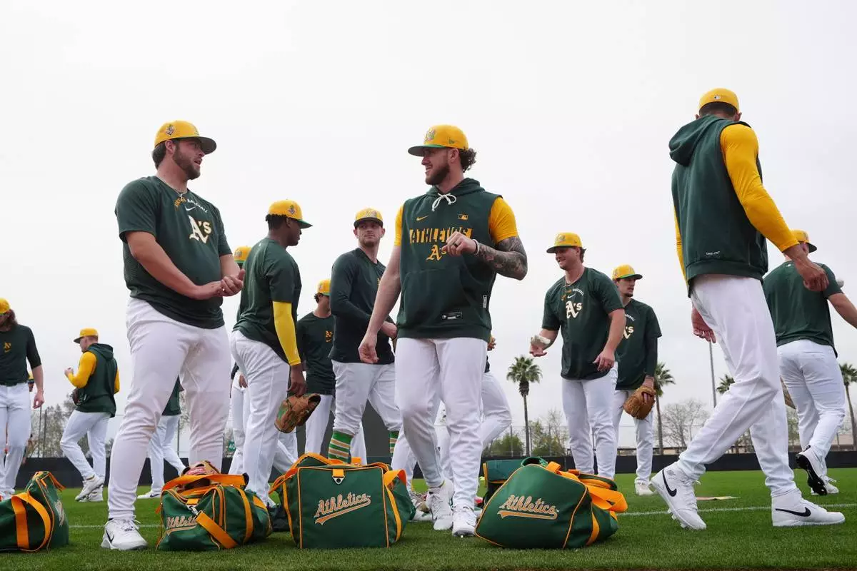 Athletics pitchers Mason Barnett, left, talks with Joey Estes, center, as they join other pitchers for workouts during spring training baseball Monday, Feb. 16, 2026, in Mesa, Ariz. (AP Photo/Ross D. Franklin)