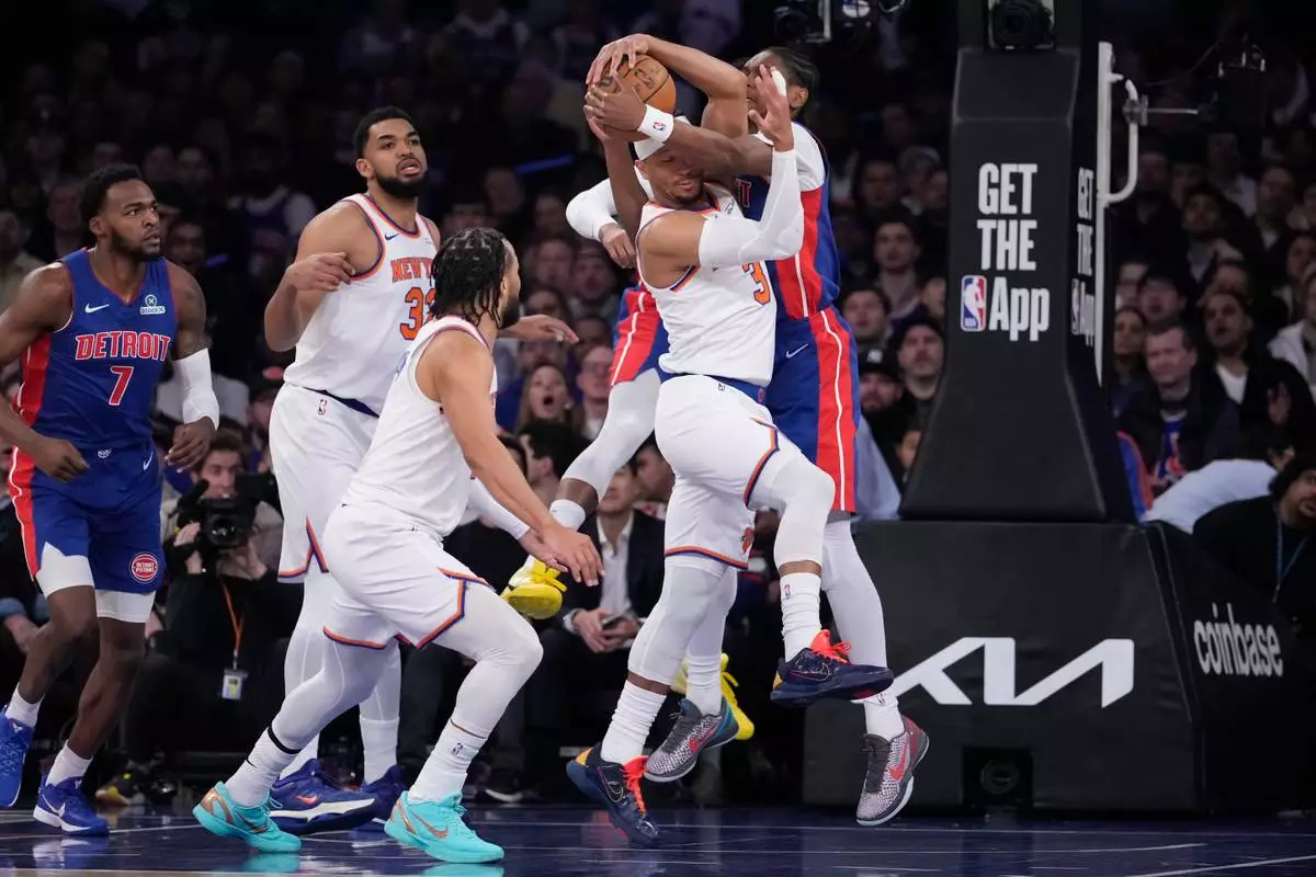 Detroit Pistons guard Ausar Thompson (9) fights for control of the ball with New York Knicks guard Josh Hart (3) during the first half of an NBA basketball game, Thursday, Feb. 19, 2026, in New York. (AP Photo/Yuki Iwamura)