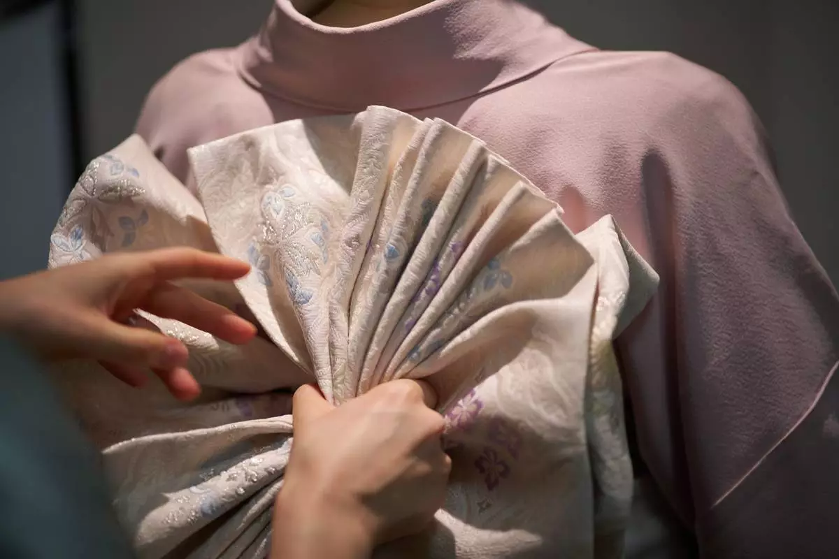 “In half a year, you can learn how to do it all by yourself,” she said, briskly demonstrating several ways to tie the obi to express different moods, from playful to understated.