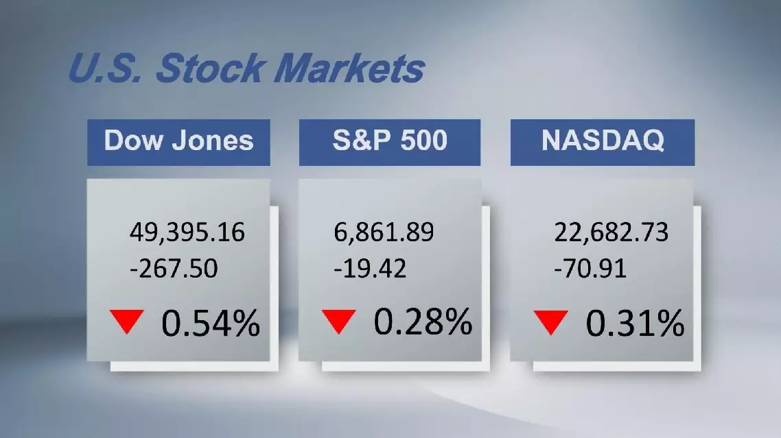 The Dow Jones Industrial Average fell by 267.5 points, or 0.54 percent, to 49,395.16. The S&P 500 sank 19.42 points, or 0.28 percent, to 6,861.89. The Nasdaq Composite Index shed 70.91 points, or 0.31 percent, to 22,682.73.