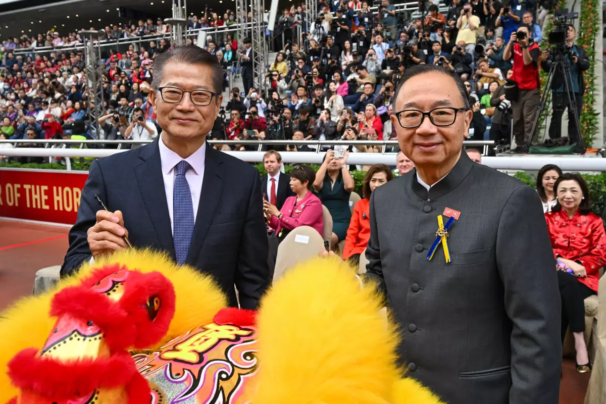 The Hon Paul Chan, Financial Secretary of the Government of the Hong Kong Special Administrative Region (left); The Hon Martin Liao, Chairman of The Hong Kong Jockey Club (right) at the opening ceremony of the 2026 Year of the Horse Raceday. Photo source: the Hong Kong Jockey Club
