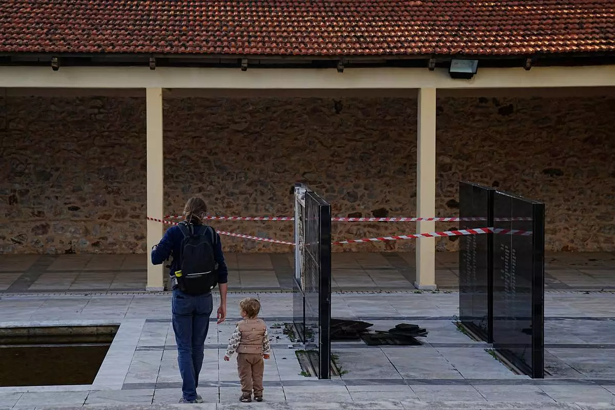A man with a child walk past a vandalised memorial plaque at the Kaisariani Shooting Range in the Kaisariani suburb of Athens, where part of a black marble monument bearing the names of 200 Greek communist political prisoners executed by Nazi forces in 1944 was smashed, Monday, Feb. 16, 2026. (AP Photo/Petros Giannakouris)