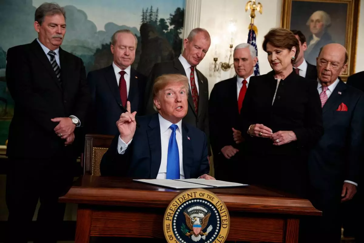 FILE - President Donald Trump speaks before he signs a presidential memorandum imposing tariffs and investment restrictions on China in the Diplomatic Reception Room of the White House, March 22, 2018, in Washington. (AP Photo/Evan Vucci, File)