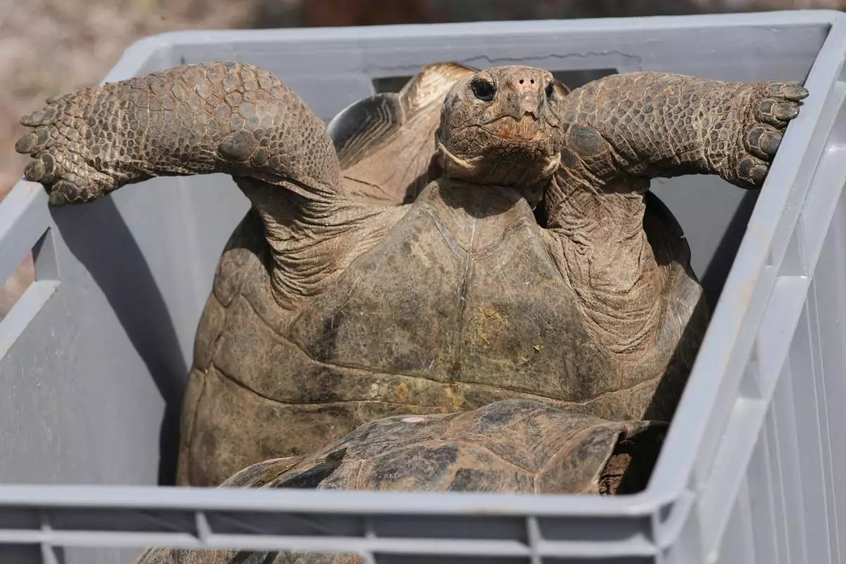 A juvenile giant tortoise sits in a box before its release on Floreana Island as part of a project to reintroduce the species to its native habitat in the Galapagos Islands, Ecuador, Friday, Feb. 20, 2026. (AP Photo/Dolores Ochoa)
