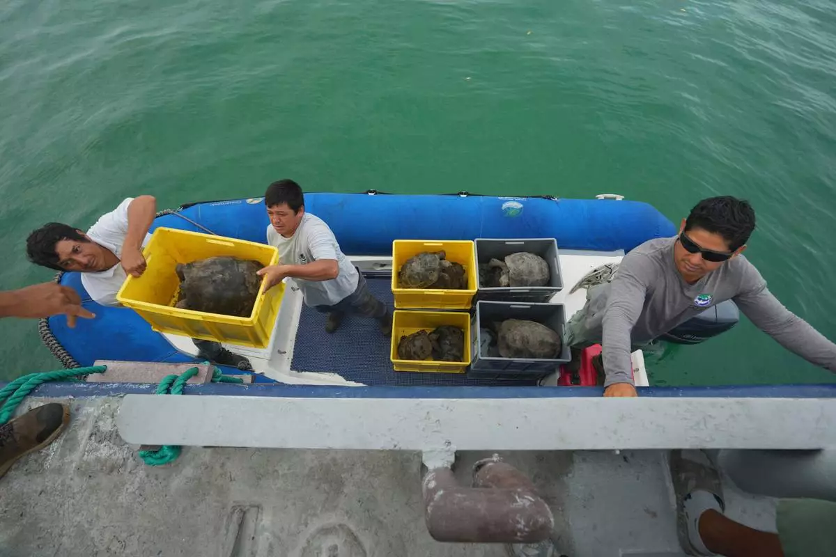 Juvenile giant tortoises are loaded onto a boat on Santa Cruz Island for transport to Floreana Island for release as part of a project to reintroduce the Floreana giant tortoise to its native island in the Galapagos Islands, Ecuador, Thursday, Feb. 19, 2026. (AP Photo/Dolores Ochoa)