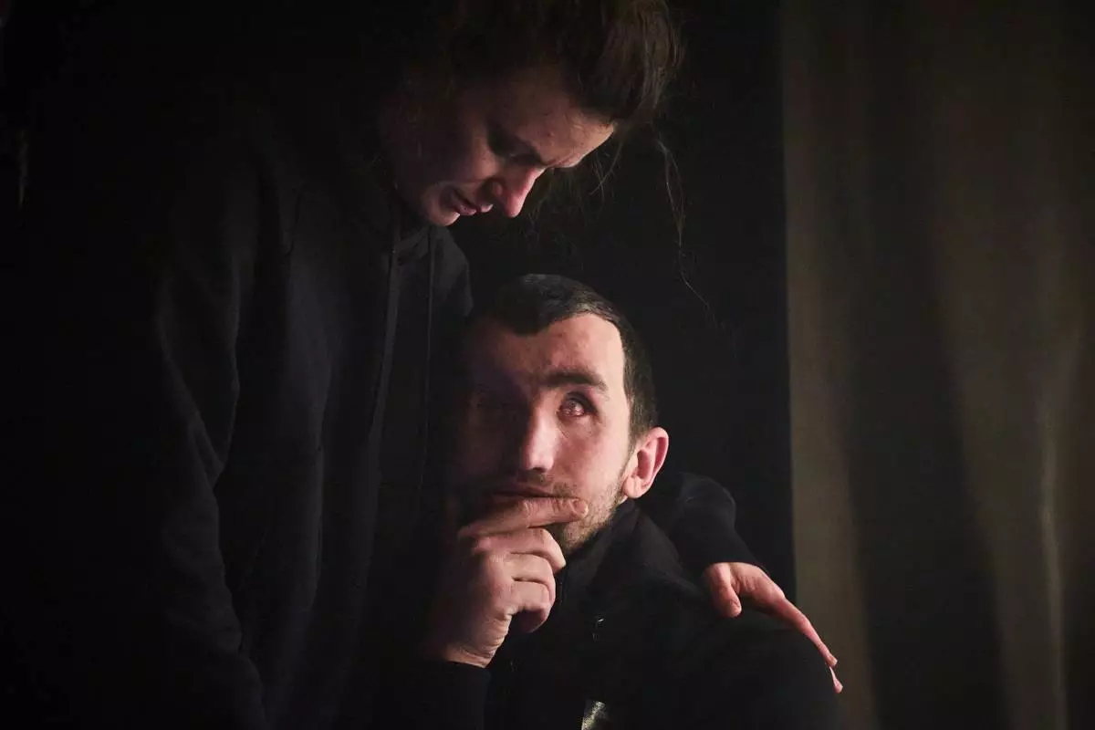 Director Olha Semioshkina supports Yehor Babenko a war veteran who sustained severe injuries in combat during Russia's full-scale invasion in Ukraine, before the premiere of an adaptation of Ivan Kotliarevskyi’s “Eneida,” a Ukrainian reimagining of Virgil’s “Aeneid,” in Kyiv, Ukraine, Thursday, Feb. 19, 2026. (AP Photo/Efrem Lukatsky)