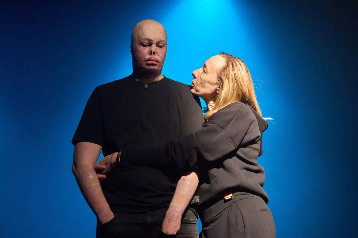 Artem Moroz, who sustained severe injuries in combat during Russia's full-scale invasion in Ukraine, performs during the play premiere in Kyiv, Ukraine, Thursday, Feb. 19, 2026. (AP Photo/Efrem Lukatsky)